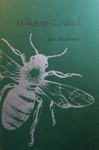 Spree MacDonald writes without punctuation in Milksop Codicil, conscious of the placement of the words, lines, and stanzas on each page and how they interact with space to produce meaning. The effect is attention to images and how they interact independent of grammatical constraint.