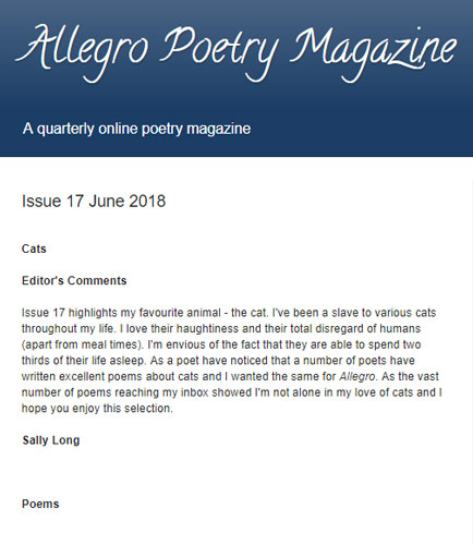 Looking back, one of my first introductions to poetry (and enjoying it) was a small set of children’s books, one filled with poetry dedicated to dogs, and the other dedicated to cats. I read them constantly, paging through them until the covers began to curl backward from my incessant touching. I couldn’t help thinking of this set of books when I received the new issue announcement for Allegro Poetry Magazine in my inbox, pleased to see the issue is dedicated to cats. Unable to currently live with any cats myself, the poetry is a nice substitute for a warm cat on the lap.