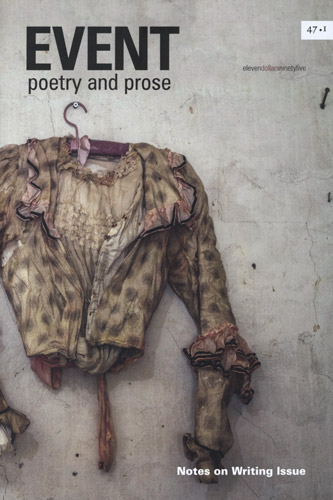 This issue draws on discomfort, on characters engaged in questions without easy answers. As a Notes on Writing issue, EVENT does not suggest writing will provide an answer to violence and blame, or to questions of identity. But as Shashi Bhat says in the Editor’s Note, these authors do a complex dance to “demonstrate conviction and humility.” EVENT proves that writing is about finding the words to ask the question, and that posing an answer, merely suggests one more answer among many.