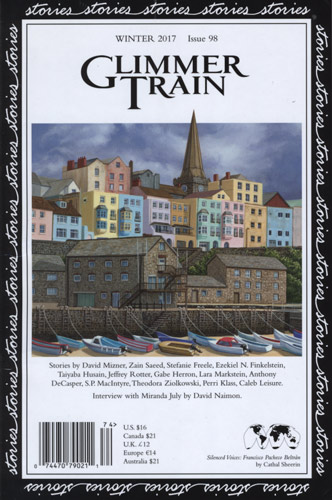 In this issue of Glimmer Train Stories, I found many wonderful stories that each shared a unique glimpse into the lives of other people and how they struggle to find meaning, love, and motivation despite the difficulties they encounter. I was also treated to personal pictures shared by the authors and pages at the end that give each of them an opportunity to express their inspiration, motivation, or experiences. These elements combined make Glimmer Train a beautiful publication, and I cannot wait to read the next issue.