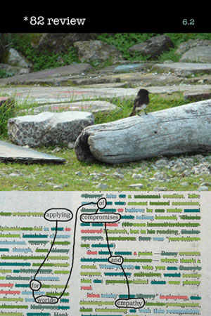 Available open access online with the ability to order quality print copy, reading Star 82 Review is like walking through an old home and discovering all kinds of cool nooks and crannies. It is filled with imagination and smart and searing perspectives succinctly conveyed in poetry and prose, including Word + Image, art, and erasure text. Each issue is identified by an erasure poem featured on the front cover. This issue: “applying for worlds of compromises and empathy.”