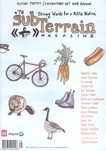 A very nice ‘extra’ is the artwork. The illustrations by Andrea Bennett not only make the cover intriguing but also add welcome breaks and commentary throughout the journal. This issue reinforces the color with the winning entries from the “colouring contest” issue. These are a great way to make the reader part of the art rather than just an observer. Overall this issue of subTerrain is as much a fun piece as it is a contribution to the intellect.