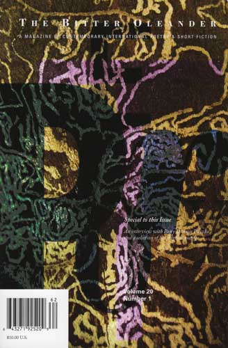 The Spring 2014 issue of The Bitter Oleander is like a smorgasbord laden with curious-looking food that you’re not sure you would like, and which even seem a little intimidating. But egged on by your adventurous spirit and that childhood admonition at the dinner table—you don’t have to like everything, but you ought to try everything—you pick it up and discover that the rewards can be great indeed. The magic lies in the deft mix of the accessible and the unfamiliar, in the selections as a whole as well as in the individual pieces. The Spring 2014 issue of The Bitter Oleander is like a smorgasbord laden with curious-looking food that you’re not sure you would like, and which even seem a little intimidating. But egged on by your adventurous spirit and that childhood admonition at the dinner table—you don’t have to like everything, but you ought to try everything—you pick it up and discover that the rewards can be great indeed. The magic lies in the deft mix of the accessible and the unfamiliar, in the selections as a whole as well as in the individual pieces.