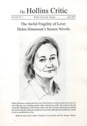 The April 2017 issue of The Hollins Critic focuses on the words of Helen Simonson in “The Awful Fragility of Love: Helen Simonson’s Sussex Novels.” Helen Simonson is the author of Major Pettigrew’s Last Stand and The Summer Before the War. Amanda Cockrell, the managing editor of The Hollins Critic and the Director of the Hollins University Graduate Programs in Children’s Literature, provides the survey of Simonson’s work, detailing the plots of these two books. In her survey, Cockrell focuses specifically on the unique and intricate relationships formed between characters in each book.