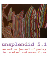 Unsplendid is an online journal that publishes poetry with form, but that form can be rather loose. With forms ranging from sonnets and sestinas to those that are made up for the sake of the poem, Unsplendid’s poems are sure to tackle language, using rhymes and repetition to further the ideas.